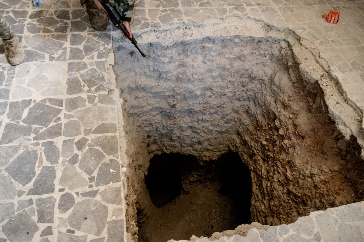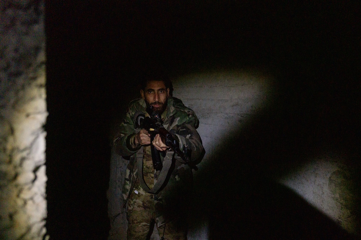 Due uomini della Sicurezza Generale ispezionano l’accesso a un tunnel scavato dalle forze curde (Gabriele Micalizzi, CESURA, per il Post)