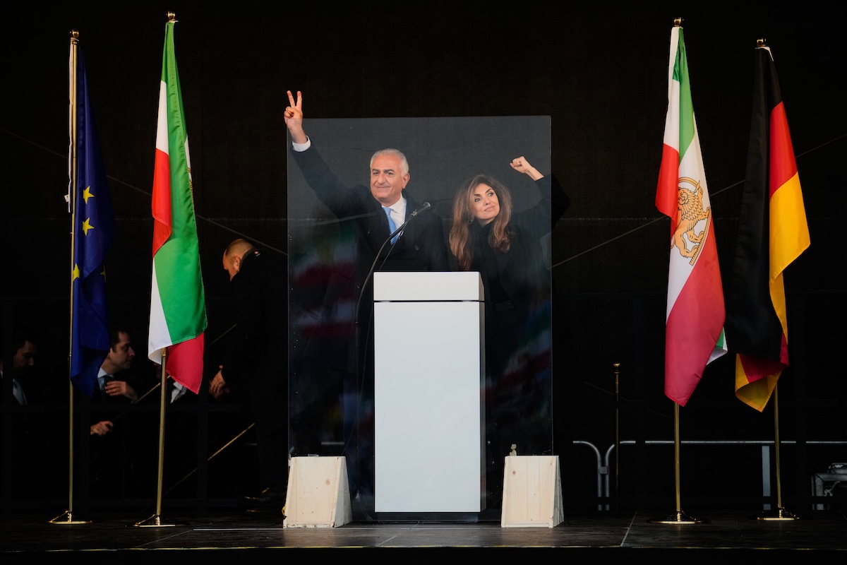 Pahlavi e la moglie Yasmine Pahlavi durante la manifestazione contro il regime iraniano a Monaco, il 14 febbraio (AP Photo/Ebrahim Noroozi)