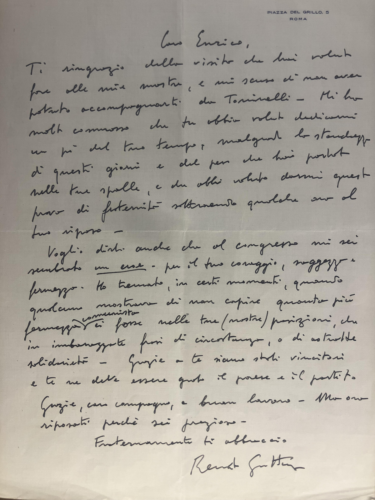 Guttuso ringrazia Berlinguer per aver fatto visita alla sua mostra. Gli è riconoscente perché immagina bene la sua stanchezza. Sa che il segretario, reduce da un congresso, si trascina un peso sulle spalle, ma nonostante tutto ha scelto, dando «prova di fraternità», di rinunciare a qualche ora di riposo e di partecipare alla mostra. «Voglio dirti anche», scrive Guttuso, «che al congresso mi sei sembrato un eroe per il tuo coraggio, saggezza e fermezza». Eroe è sottolineato, mentre la parola “fermezza”, attenzione, tornerà qualche rigo sotto.