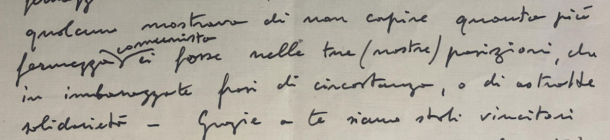 Fra le centinaia di foto, note e meno note, lettere, biglietti, video, manifesti e prime pagine dell’Unità, sono rimasto colpito da un minuscolo dettaglio, una cosa che si chiama “Caret”, un segno a penna impresso su un centimetro quadrato di carta.