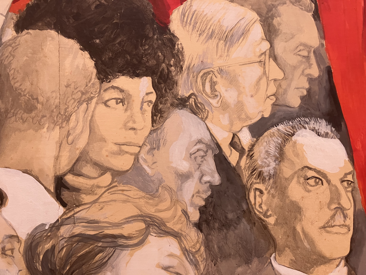 Un altro particolare di I funerali di Togliatti, esposto al MAMbo, Museo d’arte moderna di Bologna. Si riconoscono da sinistra: Angela Davis, Eduardo De Filippo, Jean-Paul Sartre, il pittore Renato Guttuso. Più in basso, Elio Vittorini (foto Ivan Carozzi)