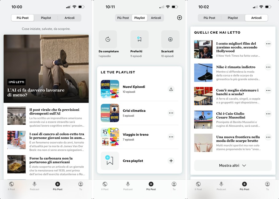 Proprio per dare seguito ad alcuni di questi suggerimenti, da qualche giorno nell’app del Post c’è una novità, che è disponibile con l’ultimo aggiornamento su Play Store e App Store. È una nuova sezione che abbiamo chiamato “Più Post” e che amplia e sostituisce quella dei “Preferiti”. Dentro ci sono diverse cose nuove che speriamo apprezzerete, e altre cose arriveranno. Dentro Più Post trovi per esempio gli articoli che hai letto da poco, quelli che hai salvato nei preferiti, ma anche quelli che sono stati più letti sul Post e quelli consigliati dalla redazione: due modi per scoprire cose che magari non avevi notato. E poi, dentro Più Post potrai creare playlist di episodi di podcast, per ascoltarli nell’ordine che vuoi tu in viaggio o quando vai al lavoro.