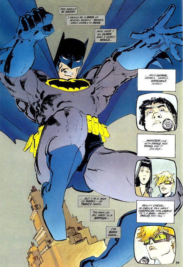 E parlava spesso per monologhi interiori, con toni alle volte nichilisti e rassegnati, altre solenni, epici e con picchi lirici notevoli. L’esempio più famoso è la frase che Bruce Wayne pronuncia all’inizio della storia, quando decide di rimettersi il costume e tornare in azione: «La pioggia sul mio petto è un battesimo: sono rinato».