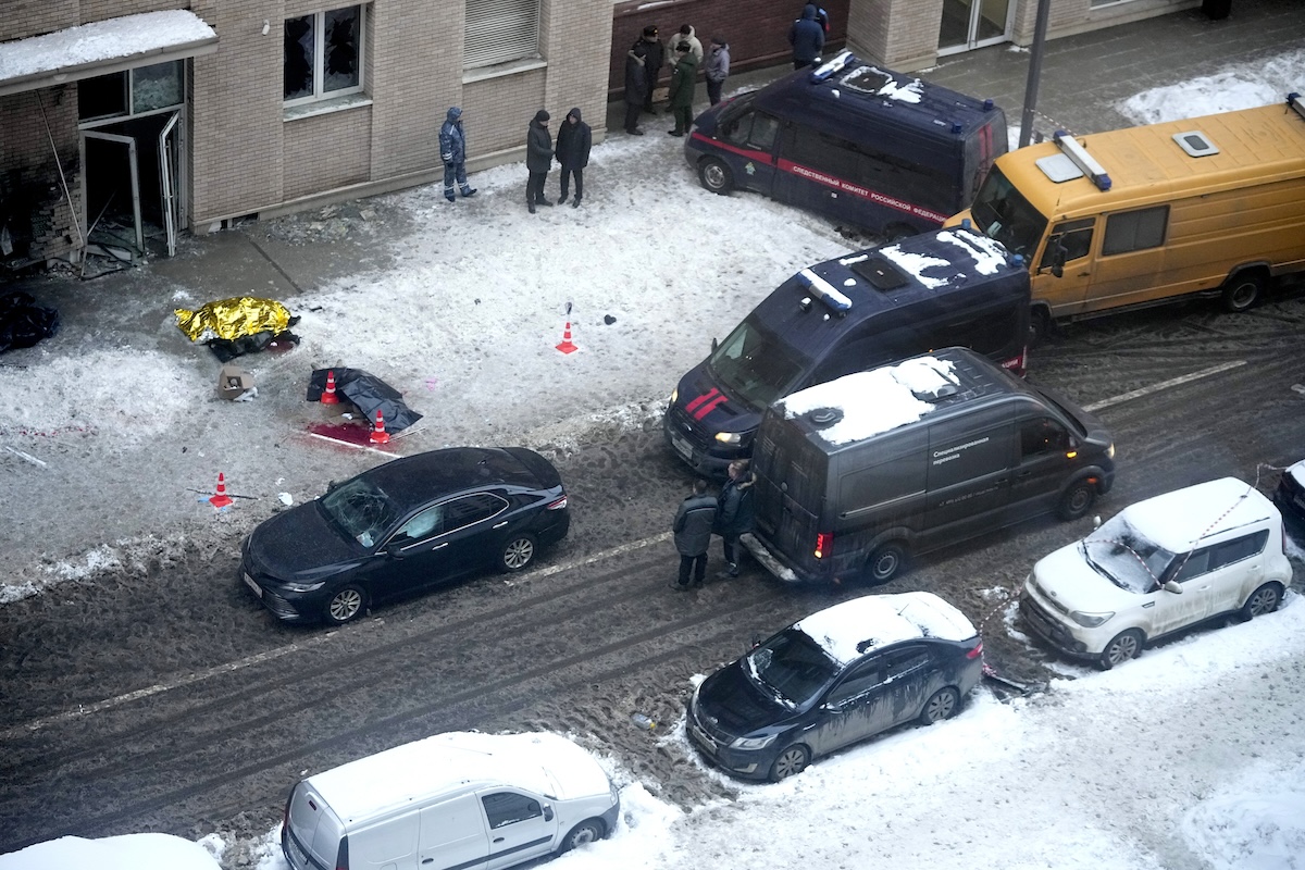 Il luogo in cui è stato ucciso il generale russo Igor Kirilliov, Mosca, 17 dicembre 2024 (AP Photo)
