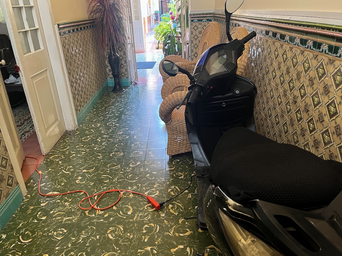 Motorino elettrico in carica in una casa di Matanzas, il 20 febbraio 2026 (Valerio Clari/il Post)