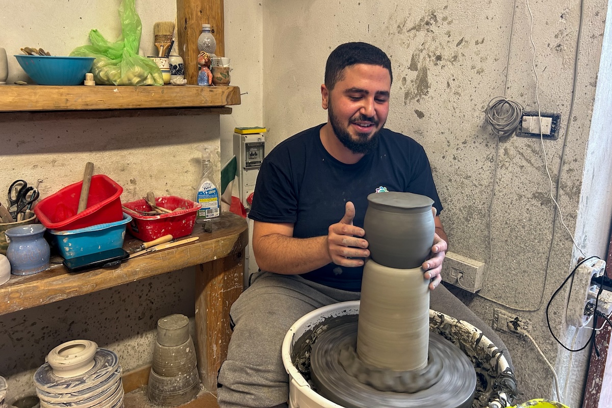 Hamza, siriano, al lavoro nel laboratorio di ceramica a Camini, 17 dicembre 2025 (Angelo Mastrandrea/il Post)