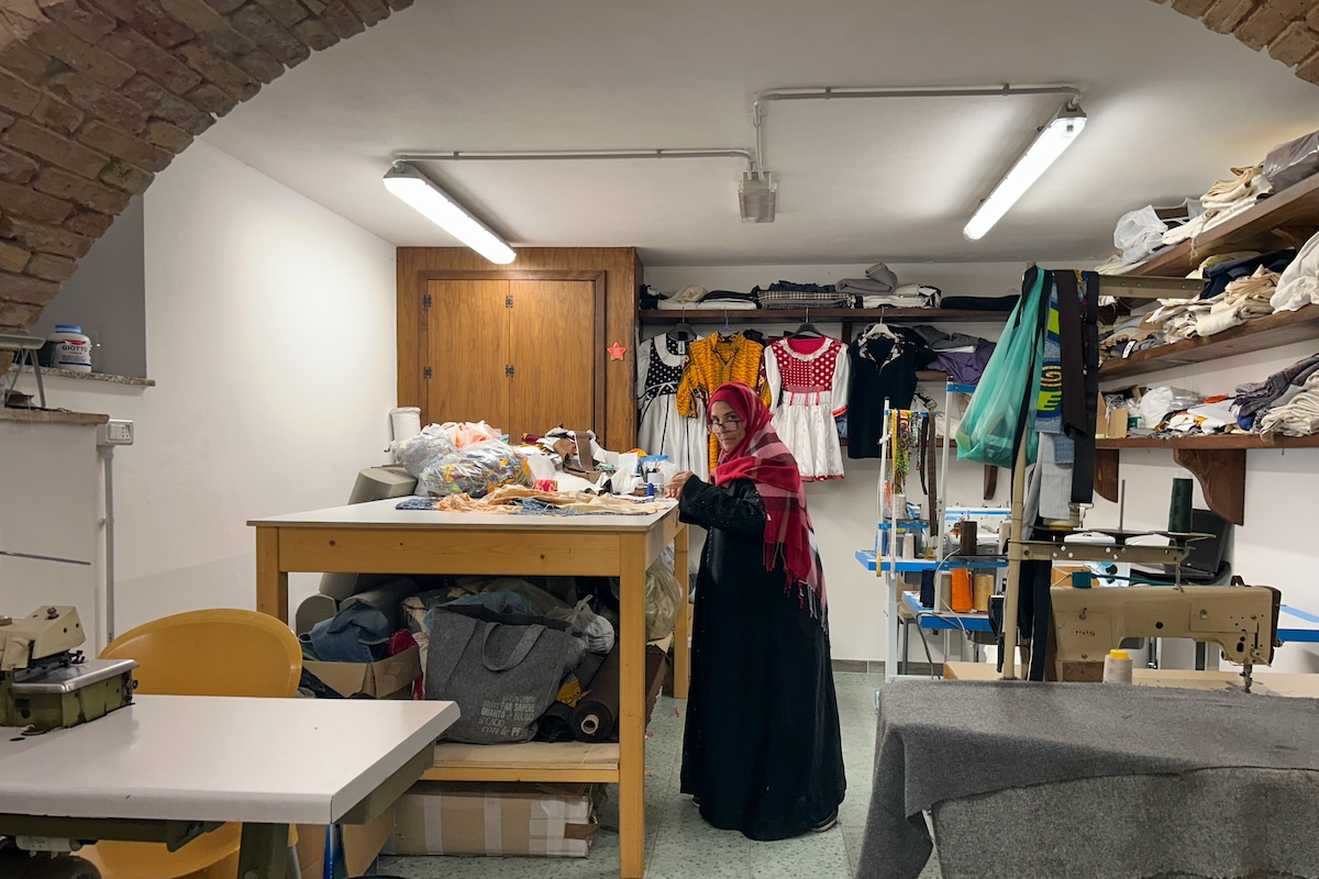 Poco più avanti, in un altro vicolo, sua madre Amal è impegnata in un laboratorio tessile a cucire tessuti in canapa, ginestra, lino e seta. Ha seguito dei corsi per imparare a usare i tradizionali telai a mano, che richiedono molta abilità manuale e precisione. Il laboratorio tessile si chiama Ama-la, che in tibetano vuol dire “donna e madre”, è stato aperto con i fondi dell’otto per mille dell’Unione buddista italiana e ci lavorano donne provenienti da Afghanistan, Libia, Marocco, Nigeria e Siria. In una piazza dietro la chiesa di San Giovanni Battista un ambulante di origine marocchina vende vestiti ad alcune donne africane. Ogni mattina carica la sua auto di merce varia e si ferma a venderla nei paesi della zona.