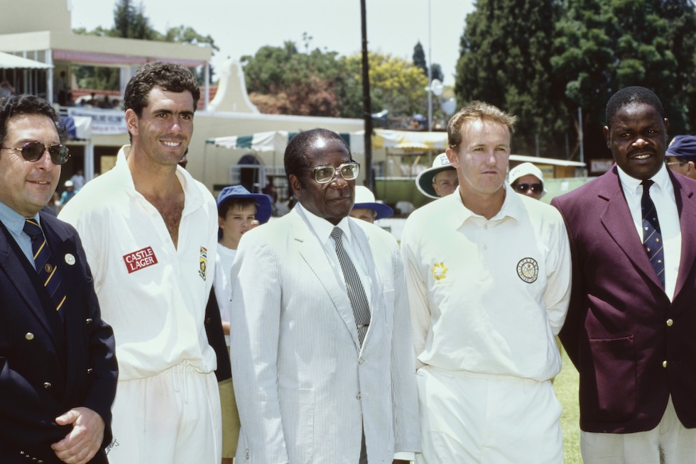 Robert Mugabe (al centro) di fianco a Andy Flower (il secondo da destra) e altre persone in occasione di una partita tra Zimbabwe e Sudafrica, 13 ottobre 1995 (Graham Chadwick/Allsport/Getty Images/Hulton Archive)