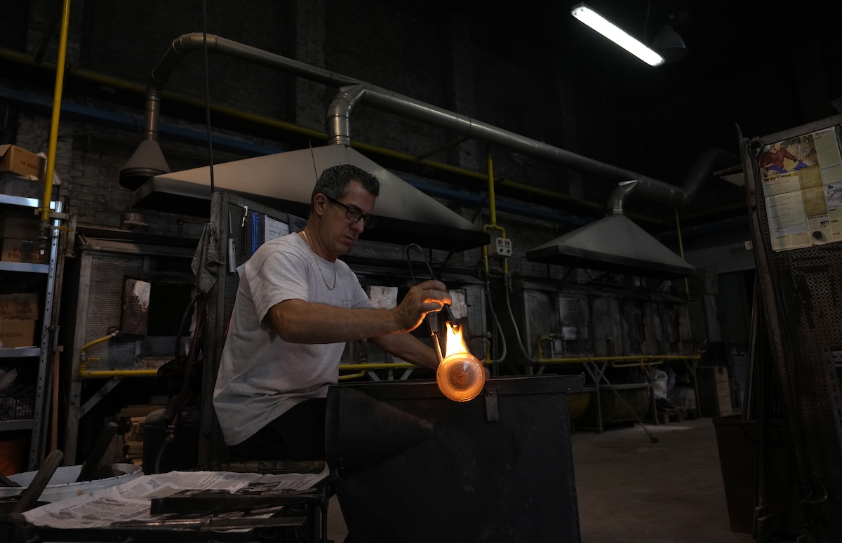 Un artigiano in un laboratorio del vetro di Murano (AP Photo/Antonio Calanni)