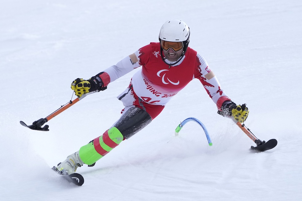 Il polacco Andrzej Szczesny alle Paralimpiadi invernali di Pechino, mentre gareggia nello slalom standing, con due stabilizzatori e un solo sci (AP Photo/Andy Wong)