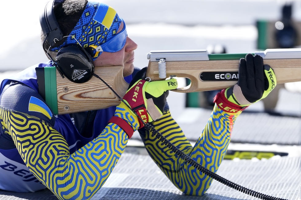 Il biatleta paralimpico ucraino Oleksandr Kazik alle Paralimpiadi di Pechino con il proprio fucile, 8 marzo 2022 (AP Photo/Shuji Kajiyama)