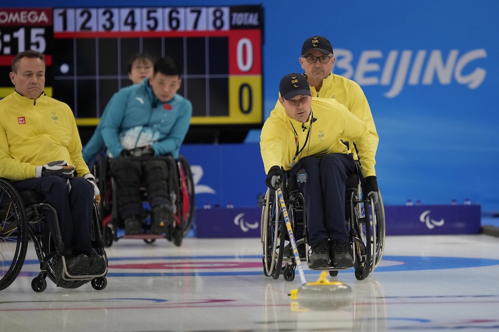 Una partita di curling in carrozzina alle Paralimpiadi invernali di Pechino, 12 marzo 2022 (AP Photo/Dita Alangkara)