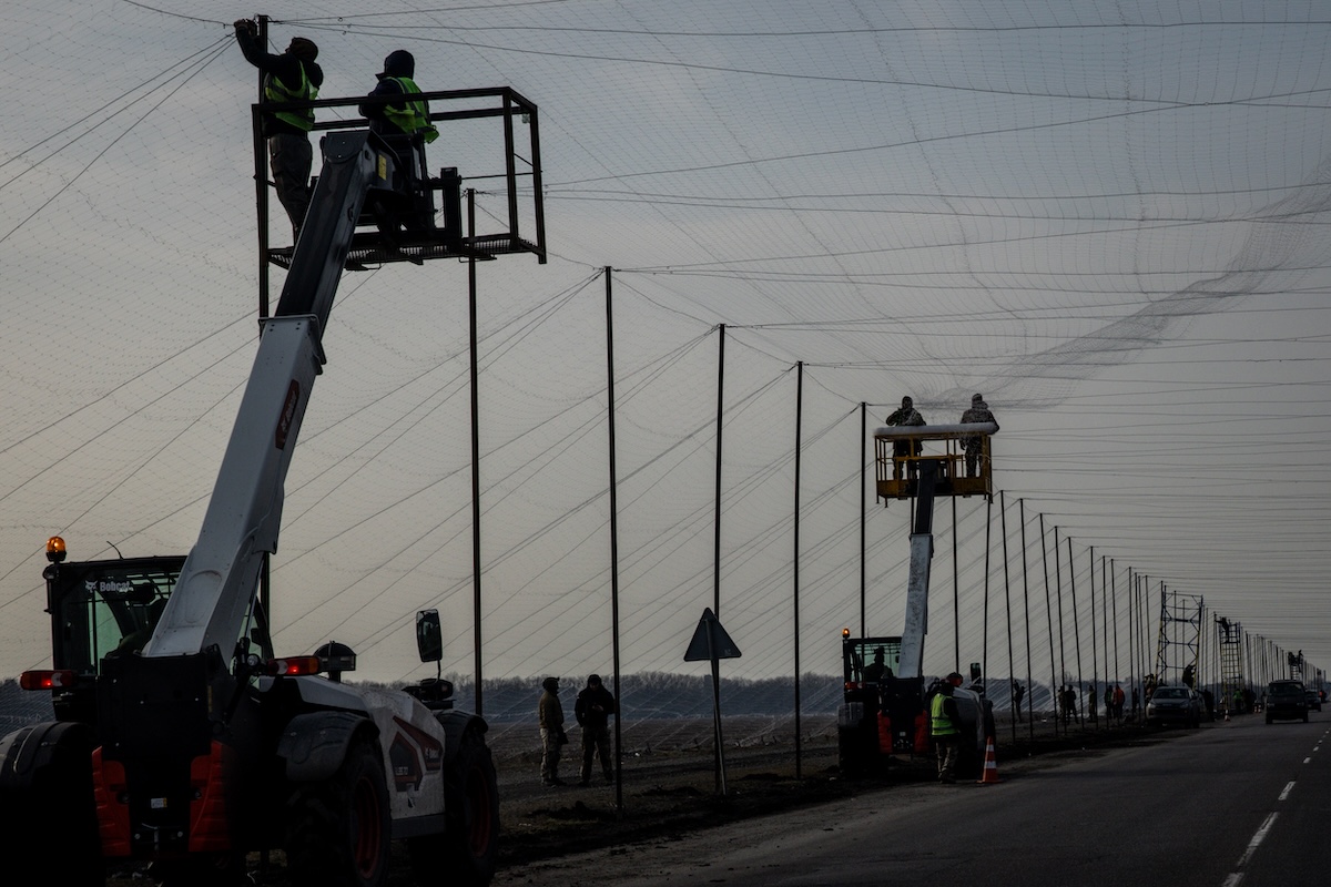 Operatori installano reti antidrone a Druzhkivka, nel Donetsk, il 2 marzo 2026 (Chris McGrath/Getty Images)