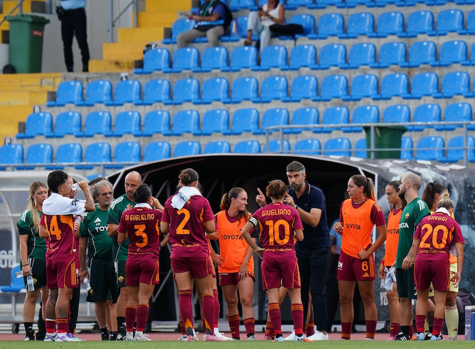 Quando cominciò alla Roma come allenatrice, nel 2018, il team a sostegno della squadra era composto da sei persone in tutto. Oggi sono il doppio, e si occupano di tutti gli aspetti del lavoro delle calciatrici: tecnici, alimentari, medici. Fra le altre cose oggi c’è una nutrizionista che cura i piani alimentari delle calciatrici e un team dedicato all’RTP (Return to play), cioè al ritorno in campo delle atlete. È composto da un fisioterapista e un preparatore atletico aggiuntivi, che si occupano esclusivamente delle giocatrici infortunate o di ritorno da un infortunio.