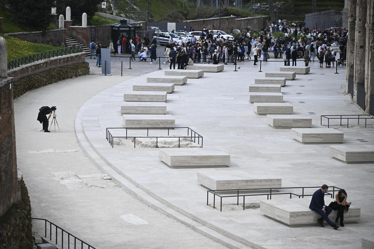 Il Parco Archeologico ha prima fatto una stratigrafia dell’area, che ha permesso di scoprire la pavimentazione originale. Nel 2024 ha cominciato gli scavi: a un metro di profondità sono emerse le tracce del Colosseo che non c’è più. I blocchi moderni di travertino, provenienti dalle cave di Tivoli, una cittadina a est di Roma, sono stati messi a partire dallo schema originario, ricostruendo le impronte lasciate da quelli originari dopo la spoliazione e sull’esempio dei tratti ancora esistenti: in corrispondenza delle due file di pilastri che sostenevano le volte della copertura sono state collocate delle sedute leggermente sollevate da terra, «per suggerire un volume perduto».