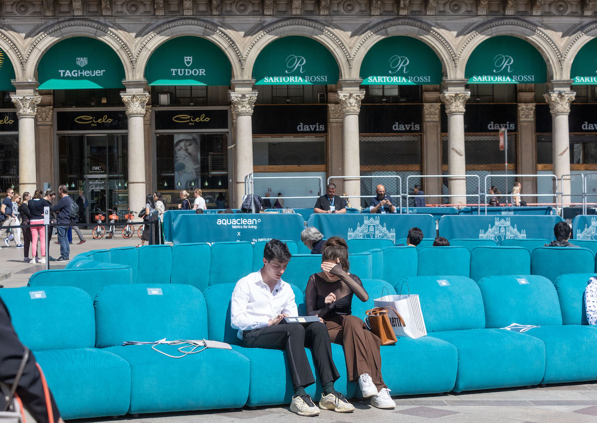 Un divano lungo 70 metri installato in piazza Duomo a Milano da Divani&Divani by Natuzzi, in occasione della Milano Design Week del 2023 (Stefano Porta/LaPresse)