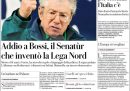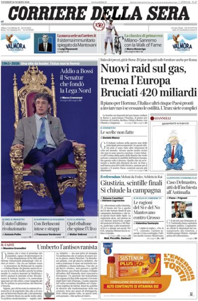 Le due notizie principali che si dividono le aperture dei giornali di oggi sono la morte del fondatore della Lega Nord Umberto Bossi e la guerra in Medio Oriente, con gli effetti dei bombardamenti sulle infrastrutture energetiche sull’economia mondiale e il piano per garantire la navigazione commerciale nello stretto di Hormuz presentato da Regno Unito, Francia, Germania, Italia, Paesi Bassi, Giappone e Canada. Qualche giornale titola invece sulla società di cui facevano parte il sottosegretario alla Giustizia Delmastro e la figlia di un uomo condannato per reati di mafia e sulla diffusione di una foto che ritrae Delmastro con quest’uomo.