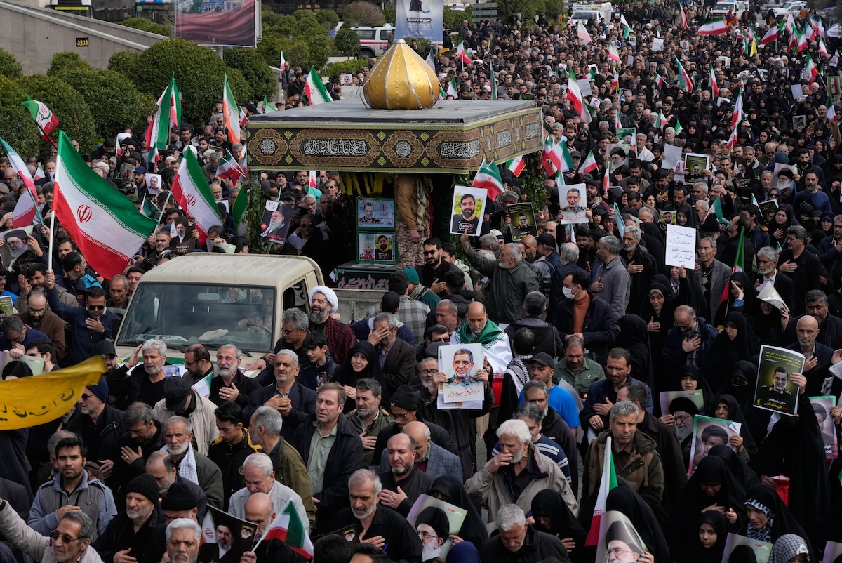 I funerali del portavoce dei Guardiani della rivoluzione Ali Mohammad Naeini, l’ultimo rilevante esponente del regime iraniano ucciso da Israele, Teheran, Iran, 21 marzo 2026 (AP Photo/Vahid Salemi)