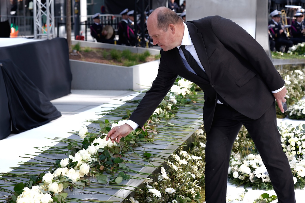 Il sindaco di Bruxelles, Philippe Close, posa un fiore durante una cerimonia per commemorare il decimo anniversario degli attentati nel quartiere europeo, 22 marzo 2026 (AP Photo/Geert Vanden Wijngaert)