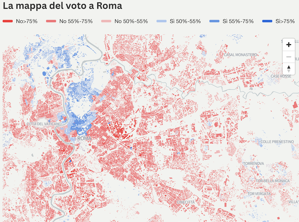 A Roma il 60,3 per cento delle persone ha votato No, il Sì non ha raggiunto il 40 per cento. Come si nota dalla mappa però nelle zone più centrali e a nord est del centro ha vinto il Sì, ma senza prendere il largo.