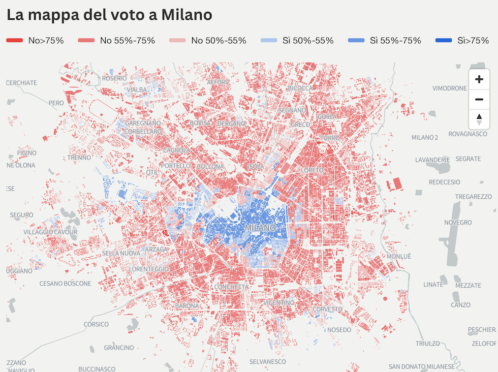 Anche a Milano ha vinto il No sfiorando il 60 per cento dei voti, mentre il Sì ha superato di poco il 41 per cento. Il Sì ha vinto soprattutto nelle zone più centrali, dove tra le altre cose ci sono molti studi di avvocati, una delle categorie più favorevoli alla riforma della magistratura. Il Sì ha avuto la meglio solo in altre sparute e piccole sezioni nelle periferie. In ogni caso la prevalenza di rosso è diffusa in quasi tutti i quartieri.