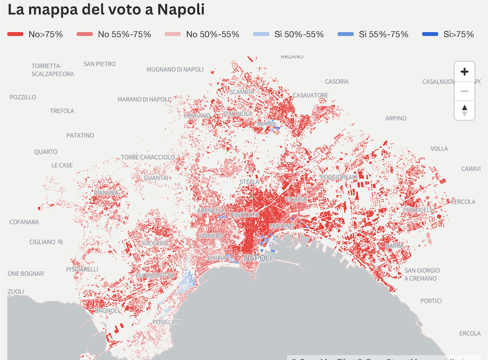 Napoli è la grande città italiana dove il No è andato meglio: ha vinto con il 75,5 per cento, come dimostra il rosso intenso della mappa. Sono pochissime, e comunque circondate dal rosso, le zone dove il Sì è riuscito a vincere pur di poco: nell’area del porto e a Mergellina.