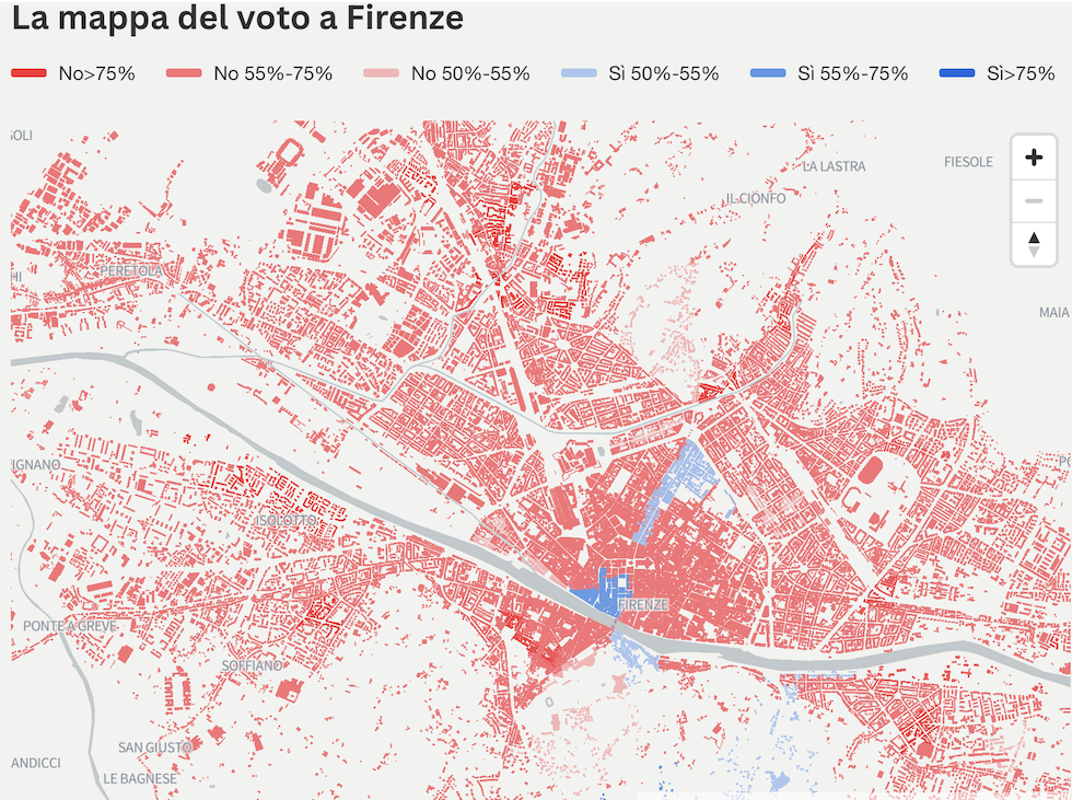 Nelle aree colorate di rosso ha vinto il No, in quelle in blu invece il Sì. Vengono colorati non i confini delle sezioni elettorali, ma gli edifici che ne fanno parte, per dare un’idea pur spannometrica di quante persone abitano in quelle zone. Semplificando molto, le uniche aree dove il Sì è riuscito a battere il No sono quelle centrali e genericamente più benestanti, mentre nelle periferie ha vinto quasi ovunque il No. Ma ogni città merita di essere osservata con attenzione.