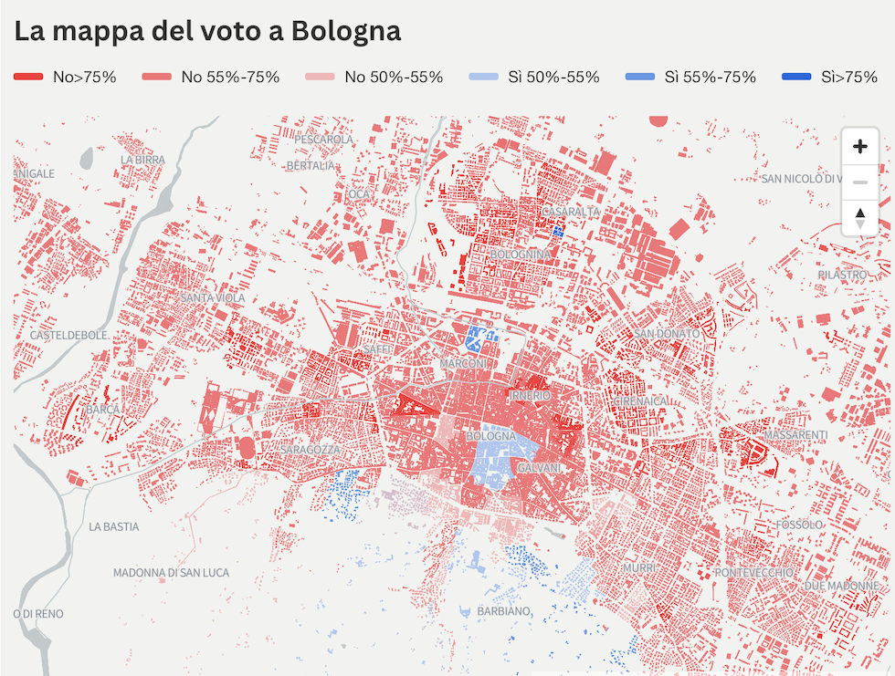 Il risultato di Bologna è interessante anche perché è stata una delle grandi città italiane con l’affluenza più alta, al 71,6 per cento. Anche qui la mappa mostra la vittoria del Sì solo in centro e nella collina, una zona piuttosto benestante della città. In generale a Bologna il No ha vinto con il 68,2 per cento dei voti contro il 31,8 per cento del Sì.