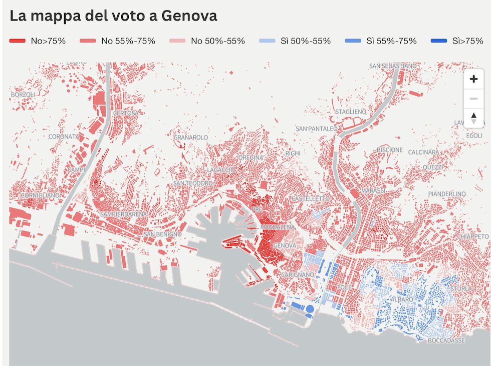 A Genova il No ha vinto con un distacco notevole nella zona del porto, mentre il Sì ha battuto il No in poche zone e tutte molto centrali: Albaro, Boccadasse, San Vincenzo.