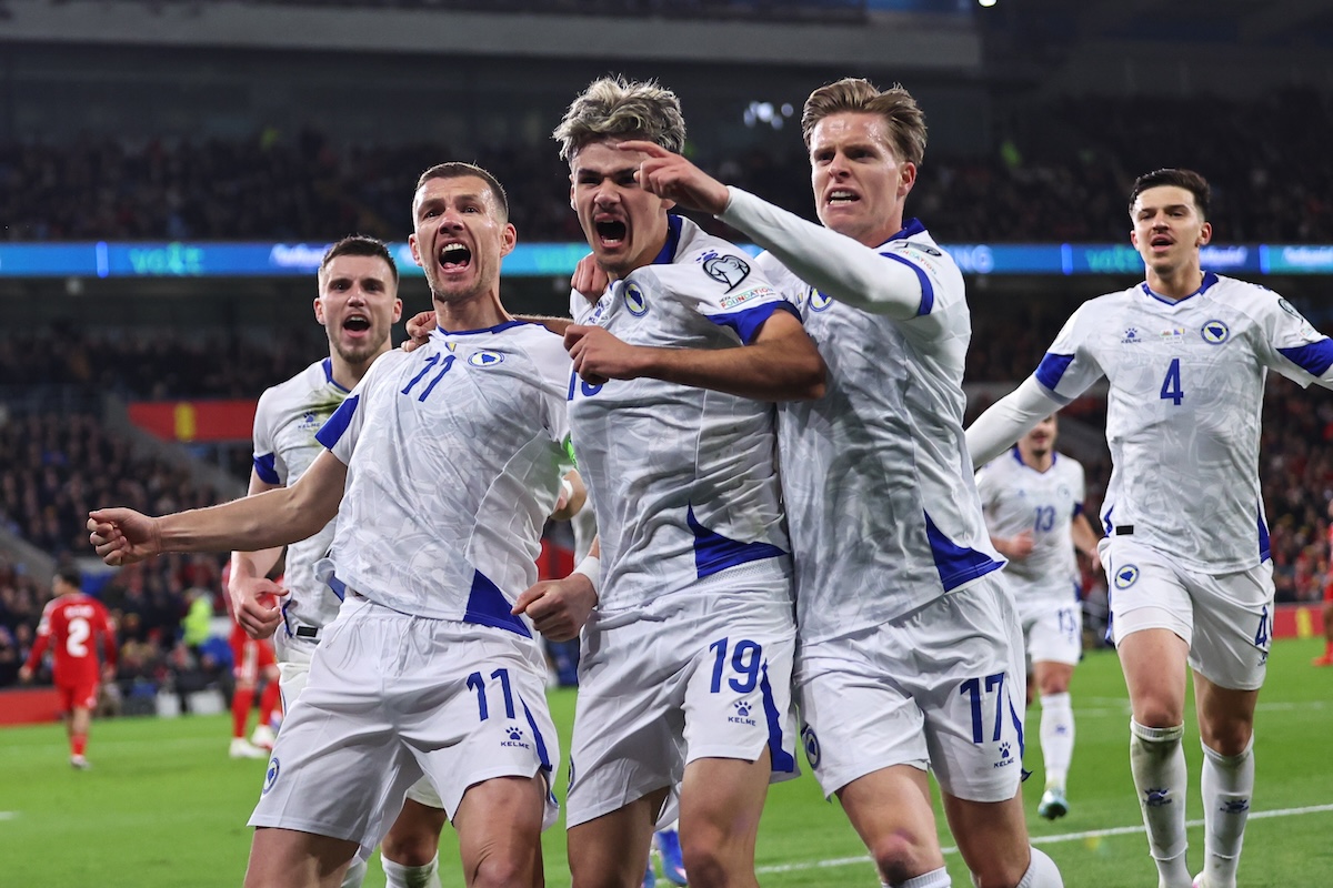I calciatori della Bosnia ed Erzegovina il 26 marzo a Cardiff, Galles (Robbie Jay Barratt – AMA/Getty Images)