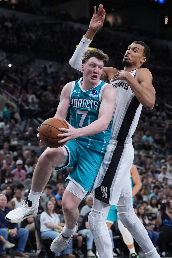 Il giocatore degli Charlotte Hornets Kon Knueppel, uno dei migliori esordienti di questa stagione, contro l’altissimo giocatore dei San Antonio Spurs Victor Wembanyama, 14 marzo 2026 (AP Photo/Eric Gay)