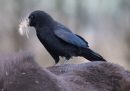 Una rana tra le felci, un leontocebo rosalia e un corvo che raccoglie il pelo dal dorso di un cavallo