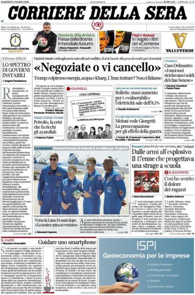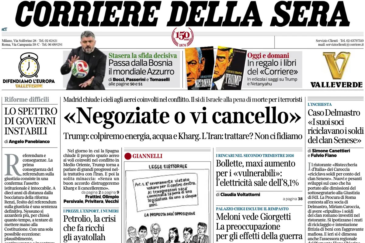 Ci sono notizie diverse in apertura sui giornali di oggi: alcuni si occupano della guerra in Medio Oriente e delle nuove minacce all’Iran del presidente degli Stati Uniti Trump, che ha detto di voler attaccare le infrastrutture petrolifere ed energetiche iraniane se non si sbloccheranno i negoziati, altri aprono sull’indagine sul ristorante di cui era socio l’ex sottosegretario alla Giustizia Delmastro, che secondo la procura veniva usato per il riciclaggio di denaro da parte della famiglia camorristica dei Senese. Altri ancora titolano sull’arresto a Perugia di un 17enne accusato di stare progettando una strage in una scuola insieme ad altri minorenni membri di gruppi online di matrice neonazista, la Stampa segue le trattative fra governo e imprese sugli aiuti economici per la transizione digitale ed energetica, il Giornale e il Tempo si occupano della vicenda dell’assistente della parlamentare europea Salis, e il Manifesto dell’introduzione da parte del parlamento israeliano della pena di morte per i palestinesi condannati per terrorismo. I giornali sportivi presentano la partita di stasera fra Italia e Bosnia, che deciderà quale delle due squadre si qualificherà per i prossimi Mondiali maschili di calcio.