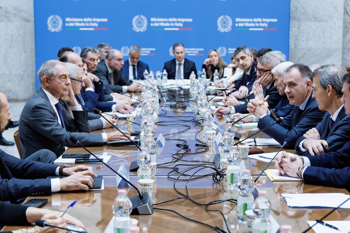 Un incontro al ministero delle Imprese tra il governo e le associazioni delle imprese, lo scorso novembre: inquadrati in primo piano ci sono a sinistra il ministro Adolfo Urso e a destra il presidente di Confindustria Emanuele Orsini (Roberto Monaldo / LaPresse)