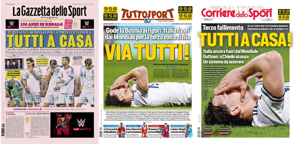 Stamattina i principali giornali sportivi hanno stampato tre prime pagine molto simili e molto da “fase rabbia”. Si parla di «tutti a casa» (in due casi su tre è proprio il titolo scelto), di «fallimento» e di sistema da «azzerare». Possono sembrare toni piuttosto forti, ma nel 2010 – quando l’Italia uscì ai gironi, da campione in carica – i titoli dei principali giornali nazionali furono ben più carichi: il Corriere dello Sport scrisse in prima pagina «VERGOGNA!», mentre la Gazzetta dello Sport parlò della «peggior Italia di sempre». Libero scrisse: «L’agonia è finita. Bidoni del Mondo». Insomma, sembra quasi che dopo tre eliminazioni agli spareggi ci abbiamo quasi fatto l’abitudine.