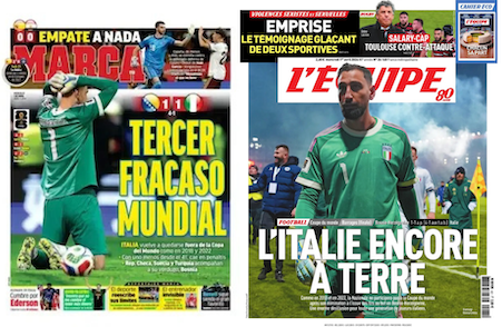 All’estero persino i due principali quotidiani sportivi di Spagna e Francia, cioè Marca e L’Équipe, hanno dedicato le loro prime pagine a questa vicenda. Il Wall Street Journal, invece, ha titolato un suo articolo: “La striscia più sconcertante nello sport continua: l’Italia mancherà di nuovo la Coppa del Mondo”.