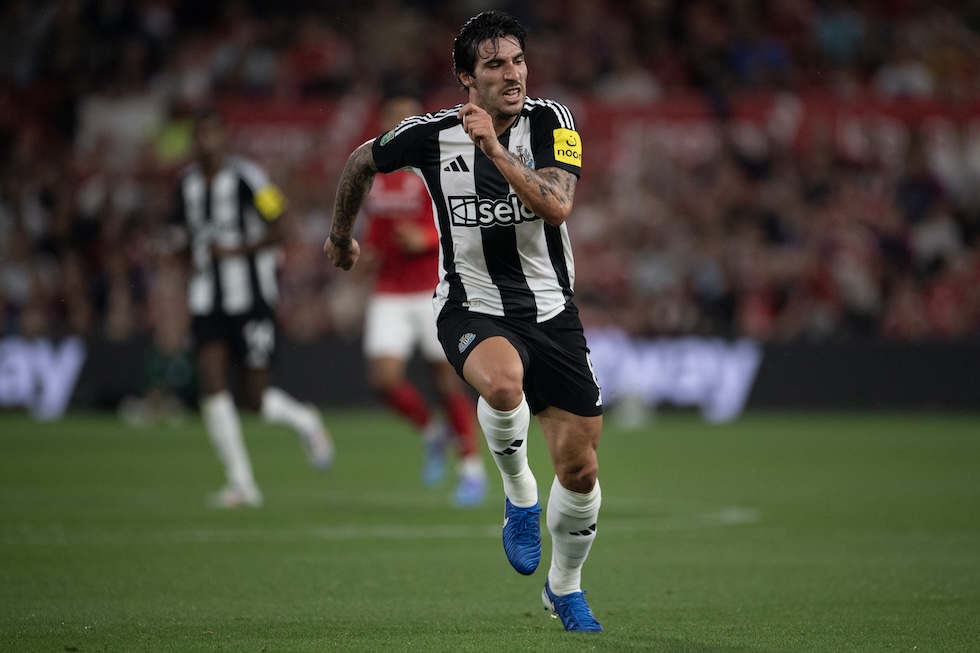 Tonali durante una partita con la sua squadra inglese, il Newcastle, nel 2024 (Joe Prior/Visionhaus via Getty Images)