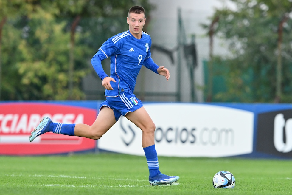 L’attaccante italiano Francesco Camarda agli Europei Under 17 del 2024. L’anno prima era diventato il più giovane esordiente della storia della Serie A, a 15 anni; oggi gioca, poco, nel Lecce. (Giuseppe Bellini/Getty Images)
