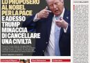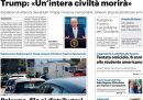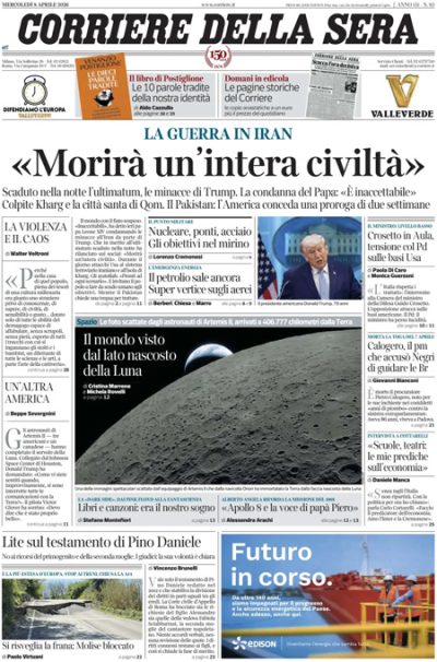 Tutti i giornali di oggi titolano in apertura sullo scambio di minacce di ieri fra Stati Uniti e Iran in attesa della scadenza la notte scorsa dell’ultimatum all’Iran del presidente degli Stati Uniti Trump, superato poi, dopo che i giornali erano andati in stampa, con l’annuncio di un cessate il fuoco di due settimane, raggiunto con la mediazione del Pakistan. Il Fatto e il Tempo titolano invece sulla diffusione da parte della trasmissione televisiva Report di una fotografia della presidente del Consiglio Meloni con un uomo accusato di far parte della criminalità organizzata.