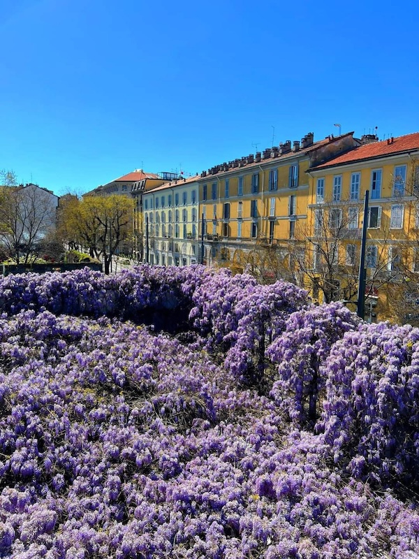 Il glicine di piazzale Baiamonti a Milano durante la fioritura del 2023 (ANSA)