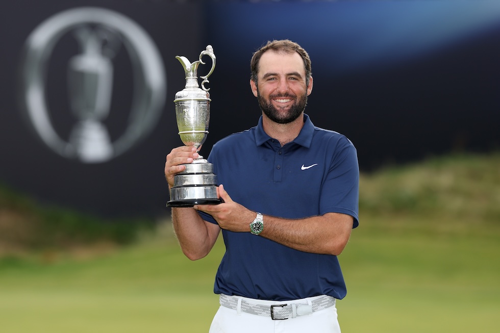 Scottie Scheffler con il trofeo dell’Open Championship, il più antico tra i Major, 20 luglio 2025 (Richard Heathcote/Getty Images)