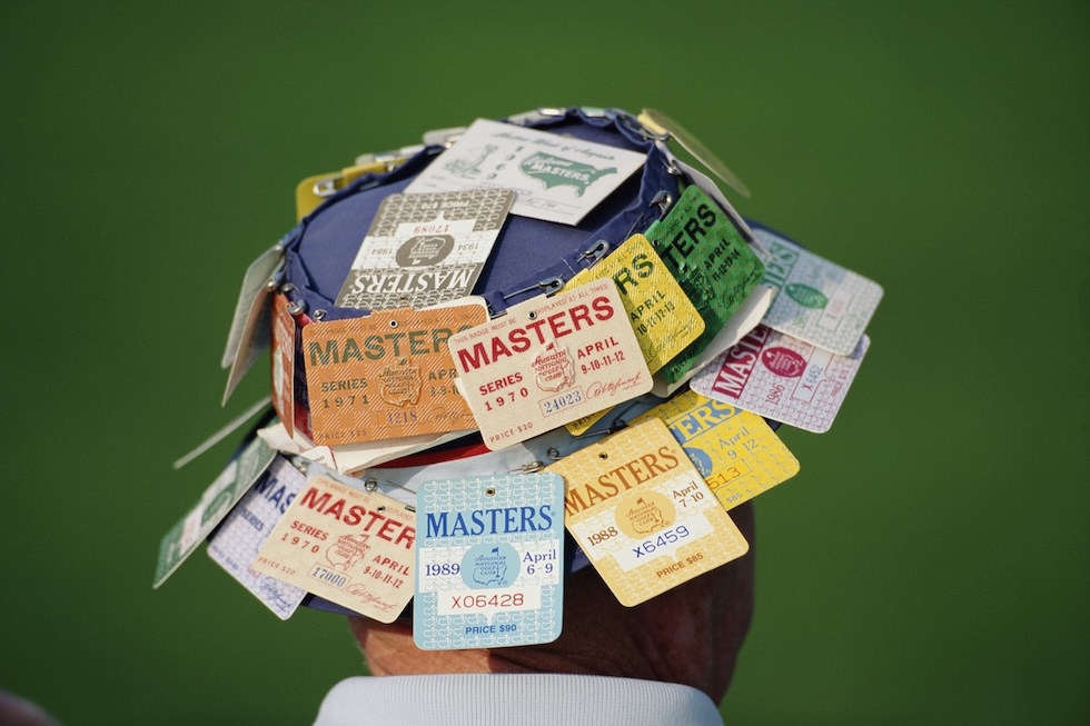 A proposito di cose poco sobrie ma accettabili: il cappello di un tifoso del Masters di Augusta, durante l’edizione del 1992 (David Cannon/Getty Images)