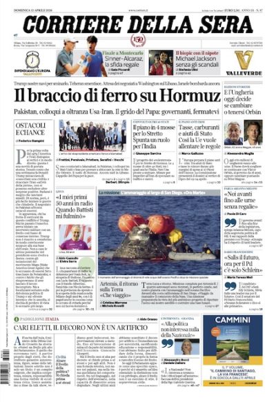 Le prime pagine di oggi aprono quasi tutte sui negoziati sulla guerra in Medio Oriente tra Stati Uniti e Iran, in Pakistan: sono falliti nella notte, e non c’è un accordo, ma dato che i giornali sono andati in stampa ieri sera i titoli stanno più indietro, sul «braccio di ferro», sulle trattative «a oltranza» e sullo «spiraglio» per un’intesa. La Stampa ha scelto di non mettere proprio in prima pagina i negoziati, dedicando invece l’apertura alle elezioni in Ungheria, che si tengono oggi. Alcuni giornali danno spazio anche alla grazia del presidente della Repubblica ricevuta da Nicole Minetti, ex consigliera regionale lombarda assai presente nel dibattito pubblico negli anni Dieci per il “caso Ruby” e per il suo stretto rapporto con Silvio Berlusconi.