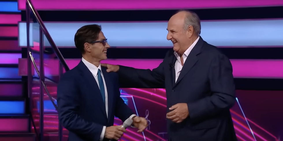 Pier Silvio Berlusconi si complimenta con Gerry Scotti per lo share (canale YouTube di Mediaset Infinity)