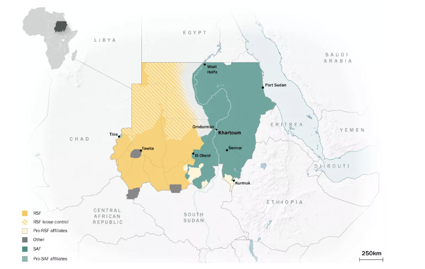 Il Sudan è diviso in due: da una parte l’esercito regolare, che controlla la parte orientale con la capitale Khartoum, il corridoio del Nilo e la città portuale di Port Sudan, sul Mar Rosso; dall’altra le Rapid Support Forces, le milizie che si sono stabilite nell’ovest e che controllano la regione del Darfur.