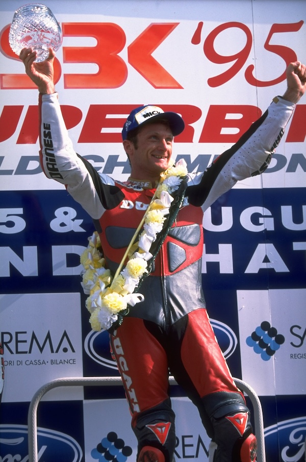 Il britannico Carl Fogarty, che vinse quattro Mondiali tra 1994 e 1999, fu uno dei più famosi piloti dei cosiddetti “anni d’oro” della Superbike, 5 agosto 1995 (Allsport UK/Getty Images)