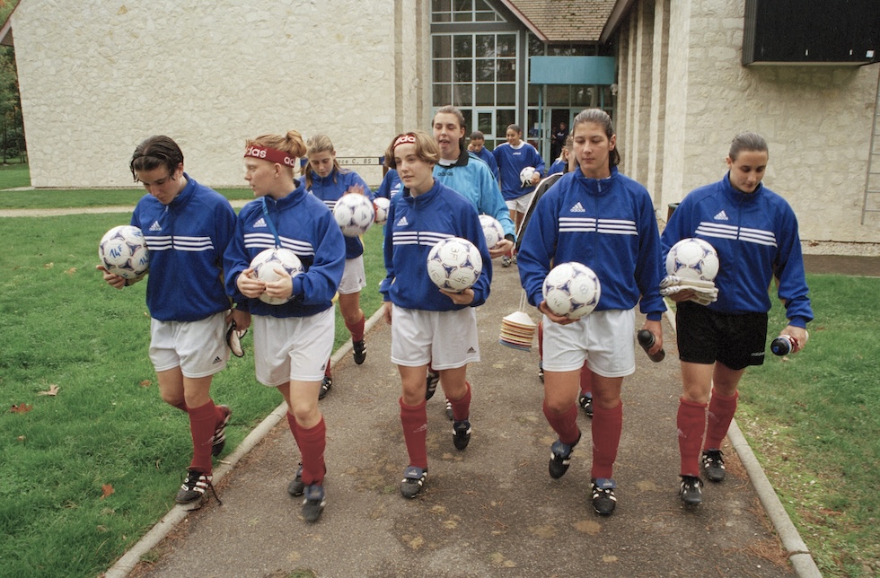 Un gruppo di giovani calciatrici a Clairefontaine nel 1998 (Julien Hekimian/Sygma/Corbis/Sygma via Getty Images)