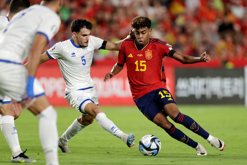 L’ultimo, eccezionale talento del calcio spagnolo: Lamine Yamal, qui in una partita giocata con la nazionale maggiore a soli 16 anni (David S.Bustamante/Soccrates/Getty Images)