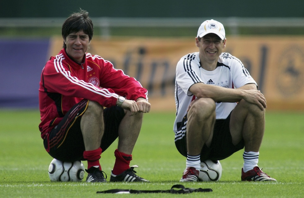 Joachim Löw, allenatore della Germania dal 2006 al 2021 e vincitore dei Mondiali del 2014, e Jürgen Klinsmann, a cui Löw fece da vice tra il 2004 e il 2006 (Lars Baron/Bongarts/Getty Images)