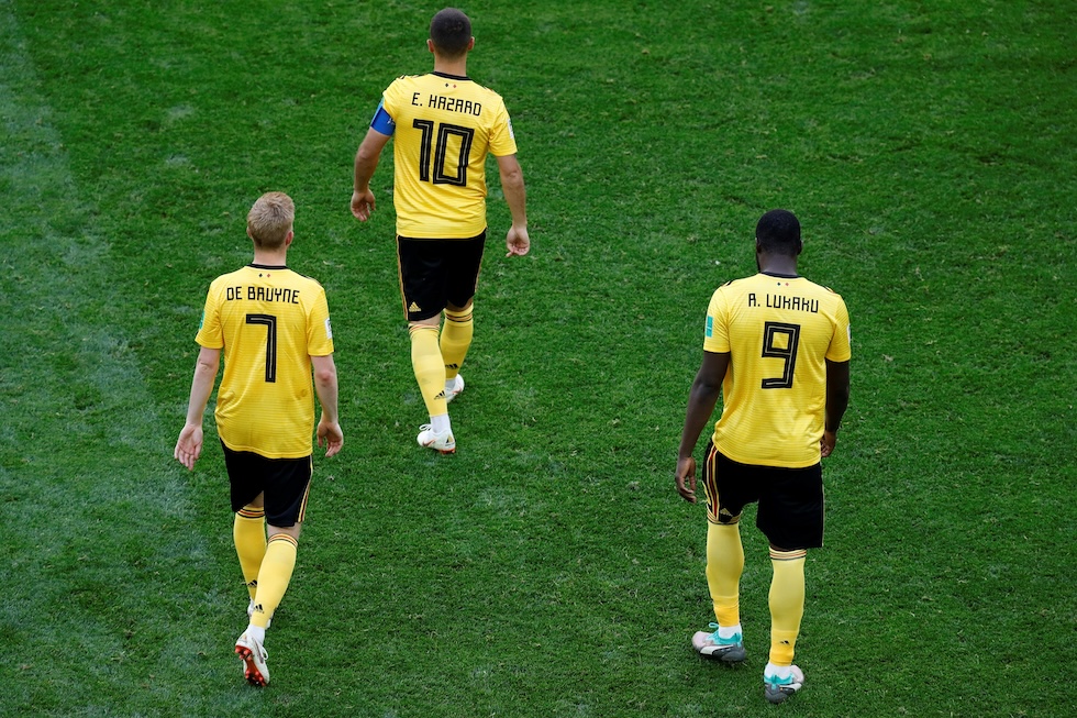 Kevin De Bruyne, Eden Hazard e Romelu Lukaku, tre dei migliori calciatori belgi degli ultimi 10 anni, ai Mondiali del 2018, in cui il Belgio arrivò terzo (Gokhan Balci/Anadolu Agency/Getty Images)
